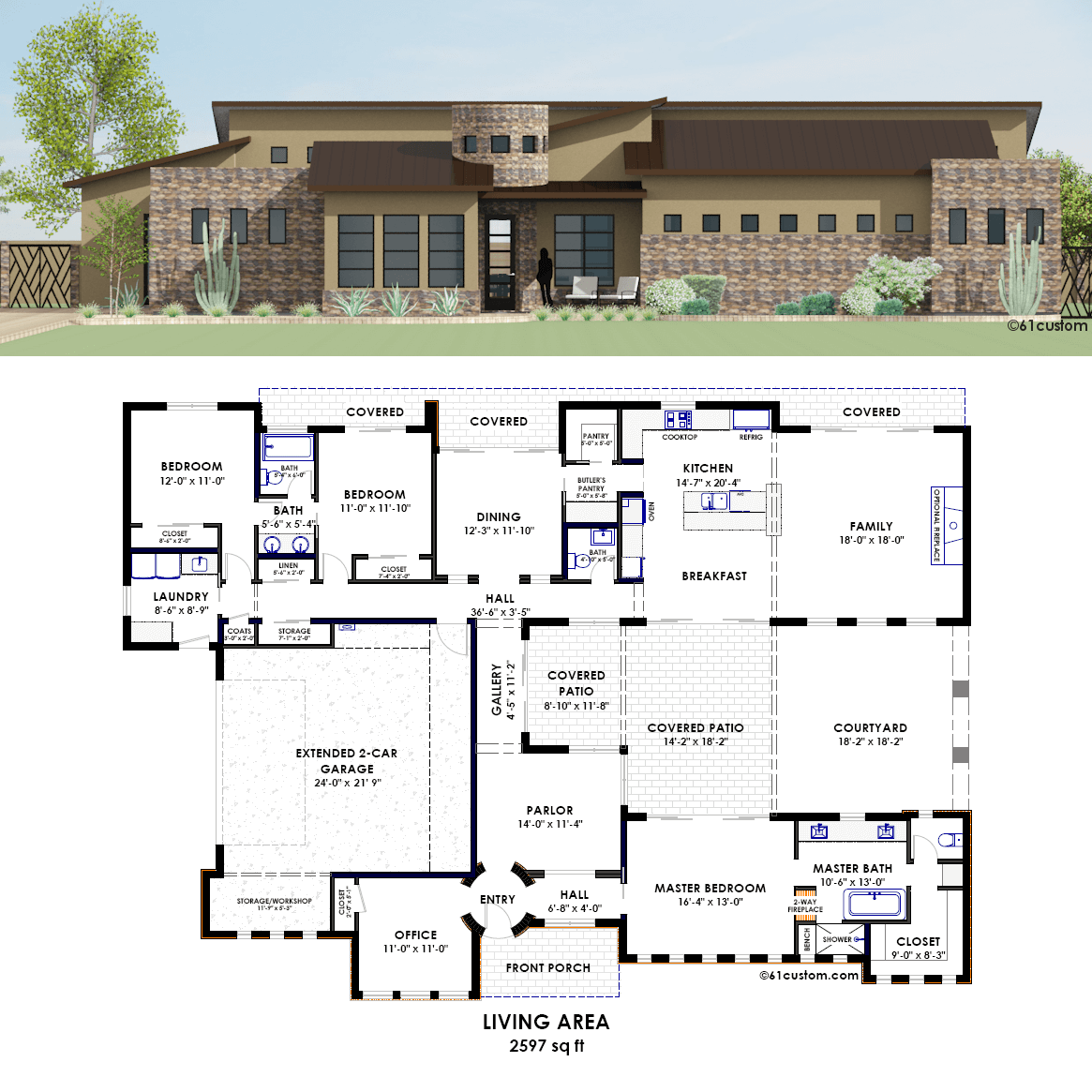 The courtyard26 single level side courtyard house plan is perfect for corner lots, wide shallow lots, or simply for added privacy. The kitchen, gallery and master bedroom open to a spacious covered patio and center courtyard that opens to the side of the home. Add outdoor curtains along the edge of the courtyard for added privacy!