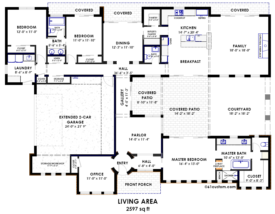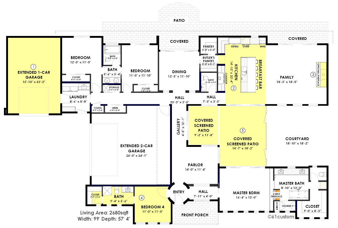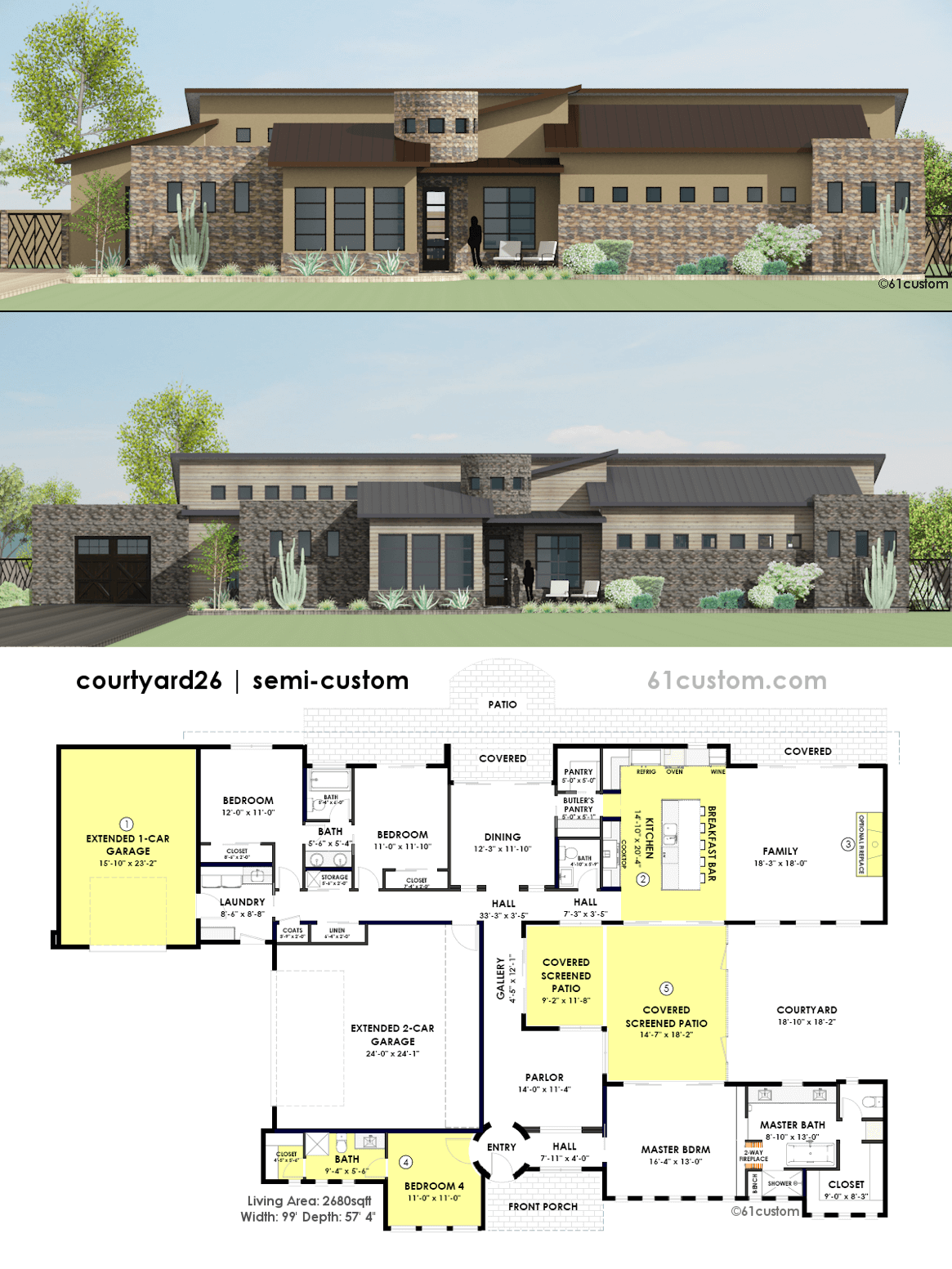 Semi-custom floorplan options include a 4th bedroom and additional bath i.l.o. office/garage storage space; additional one-car garage along the left side of the home; a screened patio at the courtyard; and a fireplace in the greatroom. 61custom configures your semi-custom home plan with any combination of these options at no additional charge.