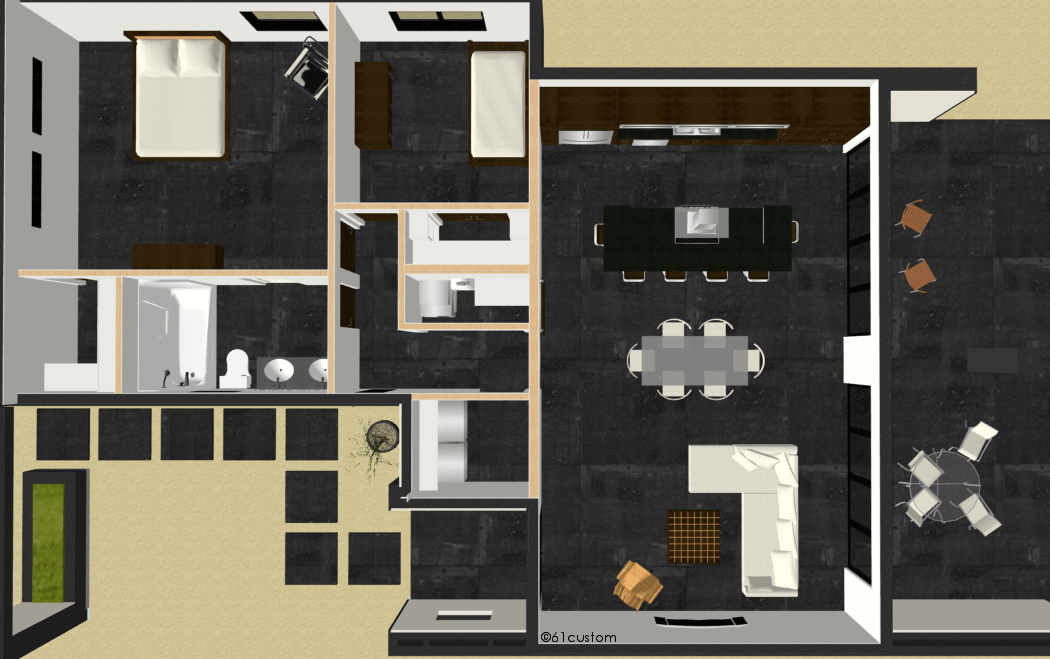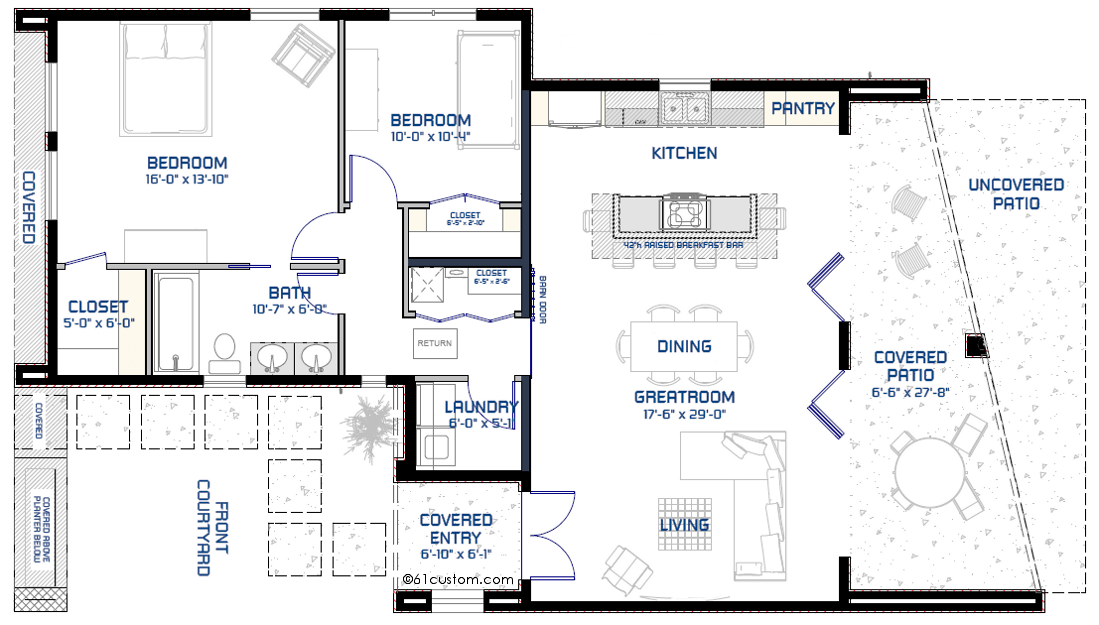 A slightly larger version of our studio900 plan, this single level small modern house plan offers two bedrooms, one bathroom, a spacious greatroom with large kitchen island, laundry room and walk-in closets. Two bi-fold doors open the greatroom up to a covered backyard patio, which makes this a great houseplan for entertaining. An inviting front courtyard area welcomes guests.