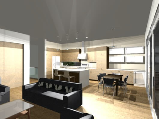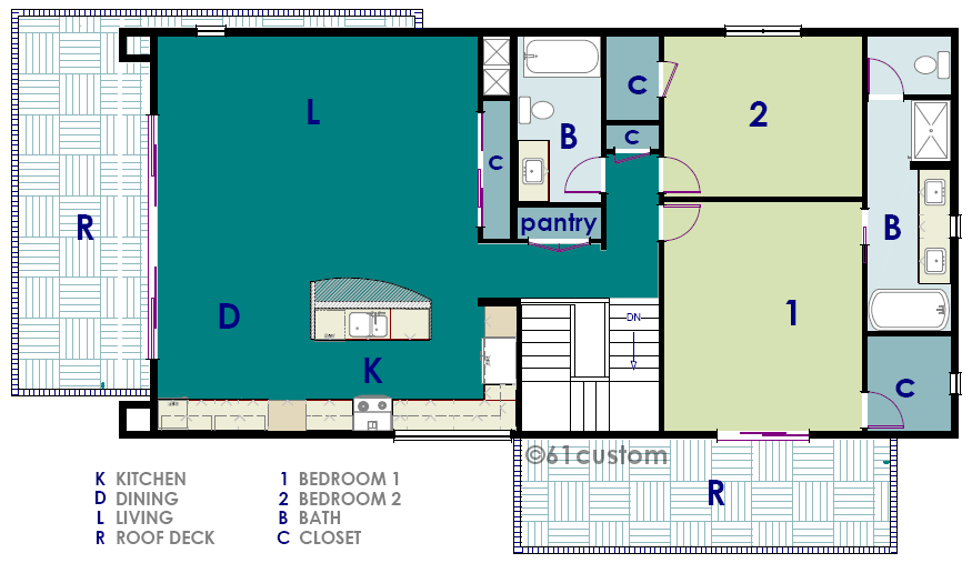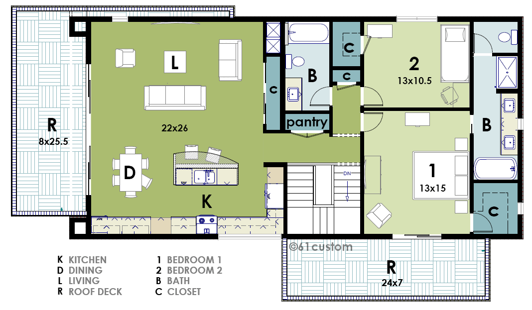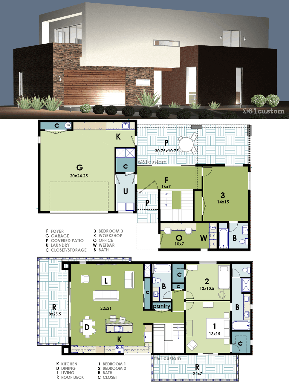 The second story offers a large loft-like modern apartment with a great room, roof deck, two bedrooms and two baths. The master bedroom also opens to a private walk-deck. This house plan is designed to allow either the long or narrow side to face front, also making it ideal for corner lots.